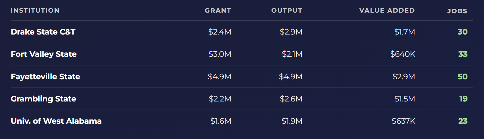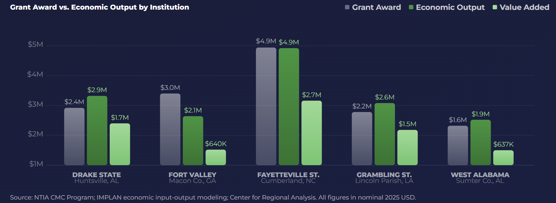The same connectivity can lead to very different economic benefits depending on what the surrounding community actually needs. Each school identified a different local opportunity and aimed at it: from fast-track cybersecurity jobs in Huntsville, to defense supply chain access in Fayetteville, to blended health and workforce pathways in the deep rural South.